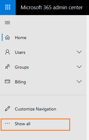 2. In the Office 365 admin center first click "Show all" in the left side navigation and then click the button called „SharePoint“.
