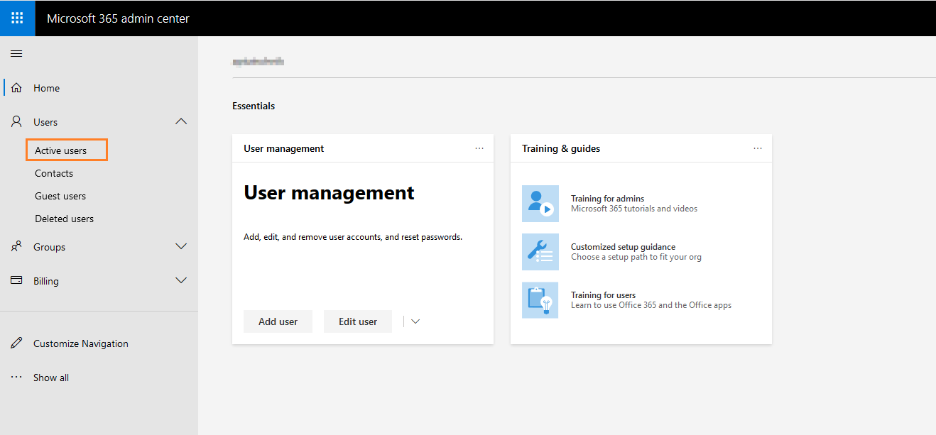 (optional) If you don't have the User Management tile available you can also click on Active Users under Users in the left navigation panel.