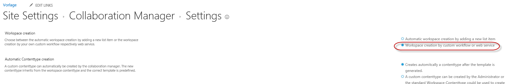1. Go to the settings of the Collaboration Manager and set the Workspace Creation to 'Workspace created by custom Workflow or web service'.